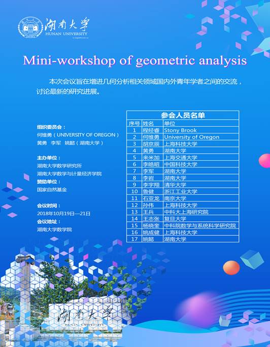 召开“Mini-workshop of geometric analysis”。会议拟邀请国内外高校院所几何分析相关问题的青年学者参会。本次会议由湖南大学数学与计量经济学院举办,受国家自然基金项目和德州扑克