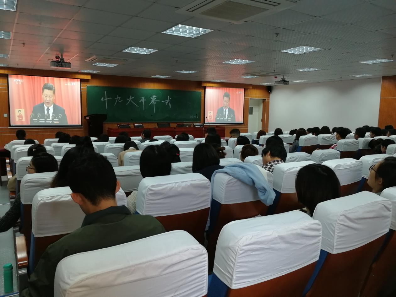数学与计量经济学院组织师生在数学院207报告厅集中观看党的十九大开幕盛况,参会人员包括数学院全体师生党员、预备党员以及积极分子。