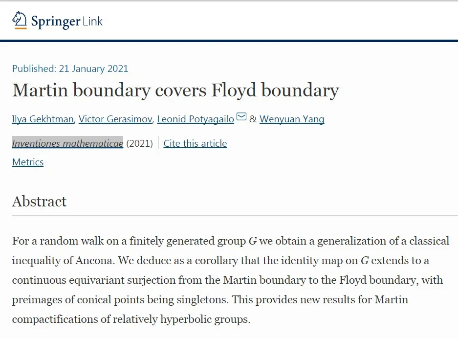 杨文元的论文《Martin 边界满射 Floyd 边界》被顶尖数学期刊 Inventiones mathematicae 在线发表