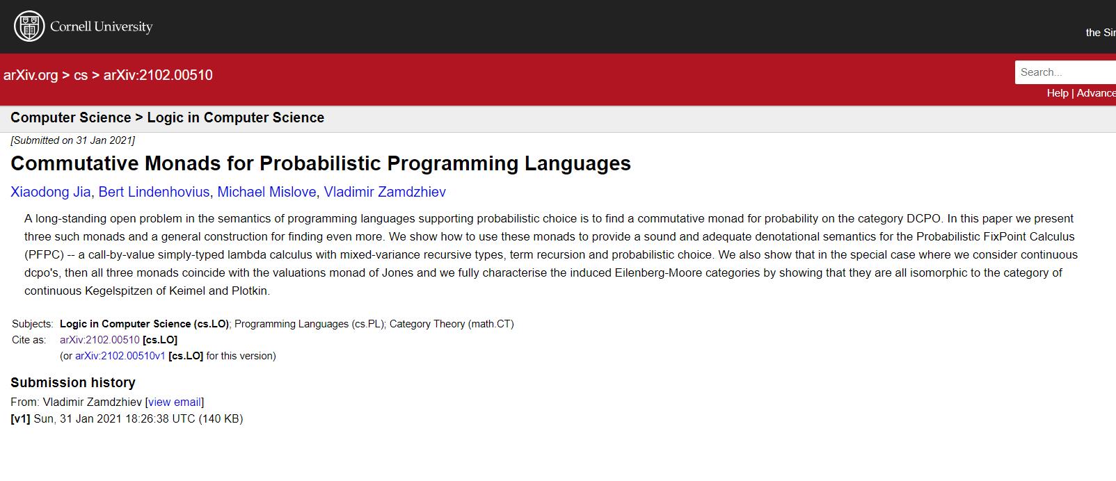 的贾晓东博士(第一作者)与合作者的论文“Commutative Monads for Probabilistic Programming Languages”在LICS2021发表。LICS(ACM/IEEE计算机科学逻辑国际会议,ACM/IEEE Symposium on Logic in Computer Science)是理论计算机科学领域最顶级的国际会议之一,成果代表着理论计算机科学的前沿,自1986年在剑桥大学首次举办至2020年,共计有9篇签署国内第一单位的论文在LICS发表。2021年,共3篇签署国内第一单位的论文被LICS接受,分别是中国科学院、复旦大学和德州扑克
