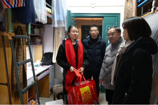 在学生宿舍里,领导们与学院学子握手问好、亲切交谈,详细了解了学生在寒假期间的吃饭、学习、运动情况,送上准备好的新春大礼包以及过年红包,并亲手为同学们带上红色的围巾。