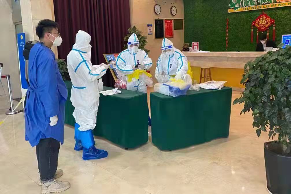 张屾(左)在酒店和医护人员一起给同学做核酸。