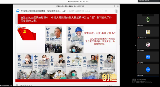 程卓蕾同志以图文并茂的方式带来大家学习思考了:疫情大考,我们看到了什么?我们领回了什么?我们能做什么?梳理总结了疫情期间,习近平总书记亲自指挥、亲自部署、亲临一线的情况,中国医务工作者、科技工作者、建筑工人、军人、社会各界广大民众在疫情期间的表现,中国人民在疫情期间展现了伟大的创造精神、奋斗精神、团结精神、梦想精神,这些伟大的民族精神为我们取得抗疫的阶段性胜利提供了弥足珍贵的力量。
