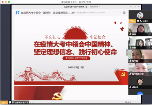 为响应学院党委疫情期间党内组织生活不断线、不变样的号召,教工第四党支部围绕在抗疫战场坚定理想信念,践行初心使命这一主题,于319上午通过腾讯会议举行线上主题党日活动,支部书记胡蕾为支部全体党员讲授《在疫情大考中领会中国精神坚定理想信念、践行初心使命》主题党课,联系支部党委委员易学军同志全程参与并作总结发言。