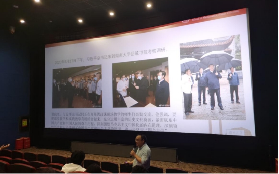 岳麓书院的情况,原汁原味的传达了习近平总书记对湖大学子的殷切嘱托,分享了优秀青年学子刘逸涵疫情期间帮助湖北尤其是武汉孩子们撑起一张线上的书桌的典型事迹,勉励大家立足本职,不忘初心,做出力所能及的贡献。